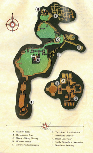Built as an extension to a huge abandoned mine complex, the city of Ak'Anon sprawls out with a huge cavern, which constantly echoes with the sound of mechanical devices ticking and whirring. Travelling within the city can be confusing for a visitor as the city shares the cavern with a huge lake that meanders through it that forces people to take long indirect routes. The Gnomes however have provided mechanical guides that stand around on the main paths and can lead the lost to their destinations.